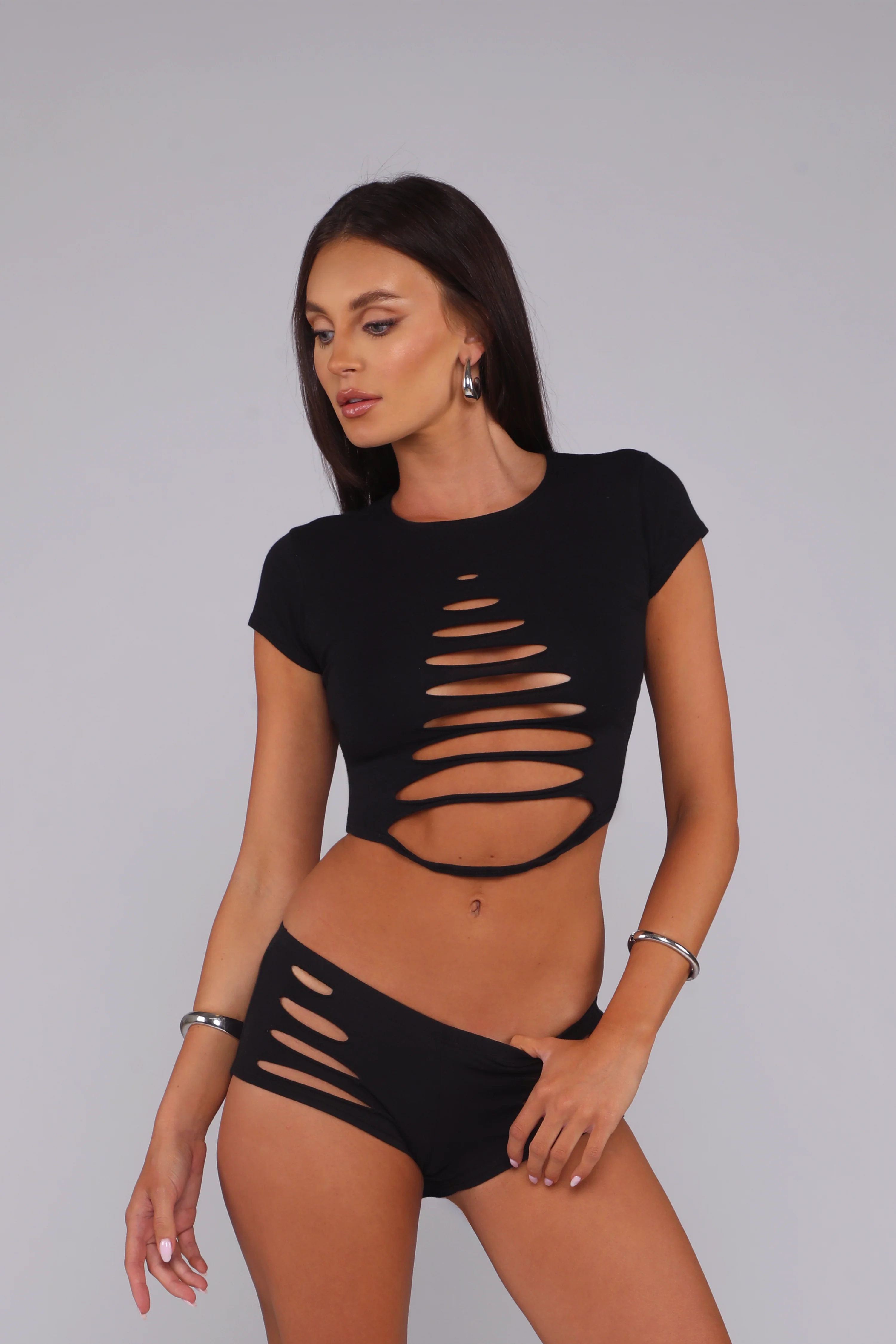 Your go-to, stage-ready shorts. The Cutaway Shorts are made from a super-soft cotton blend and perfectly broken-in. With a precision laser-cut and finished with a raw edge.. these shorts are worn-in, lived-in, and ready to steal the spotlight! They’re the shorts you throw on for late-night shows, back-alley dives, and every after-party in between.